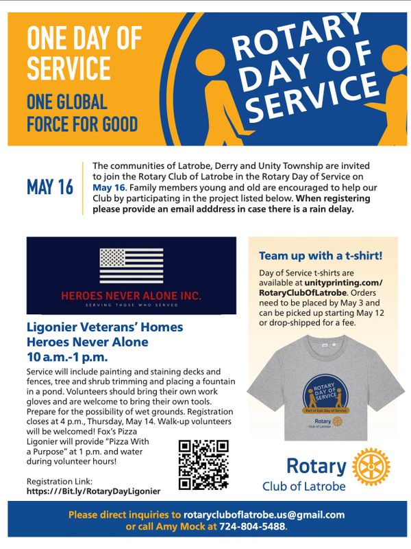 Day of Service T-shirts are available at unityprinting.com/RotaryClubOfLatrobe. Orders must be placed by May 3 for pickup starting May 12 or shipping for an additional fee.