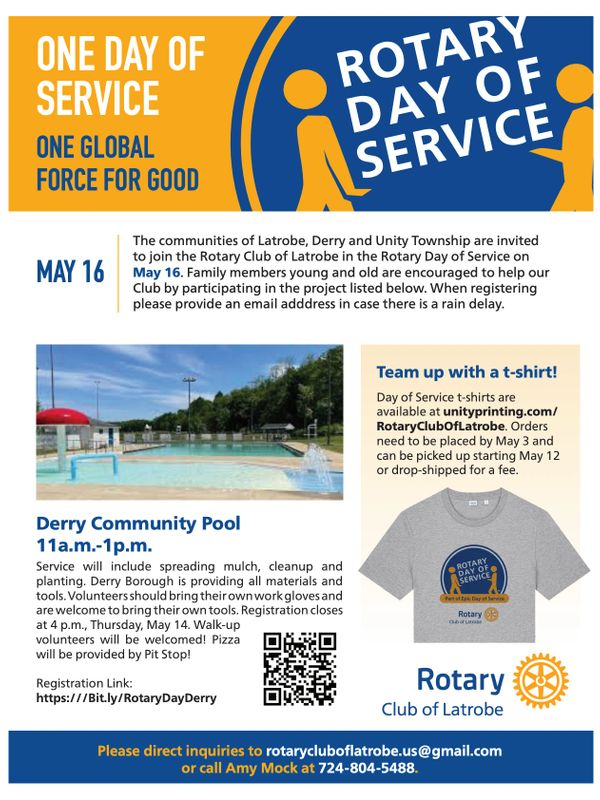 The communities of Latrobe, Derry, and Unity Township are invited to join the Rotary Club of Latrobe for our Rotary Day of Service on Saturday, May 16. Join Rotary clubs across our region as we serve our communities—choose from two local opportunities: help beautify the Derry Community Pool or assist with improvements for local veterans. Volunteer for one of these projects or find another opportunity near you. Learn more about Rotary Day of Service opportunities across the region at www.rotarydistrict7305.org